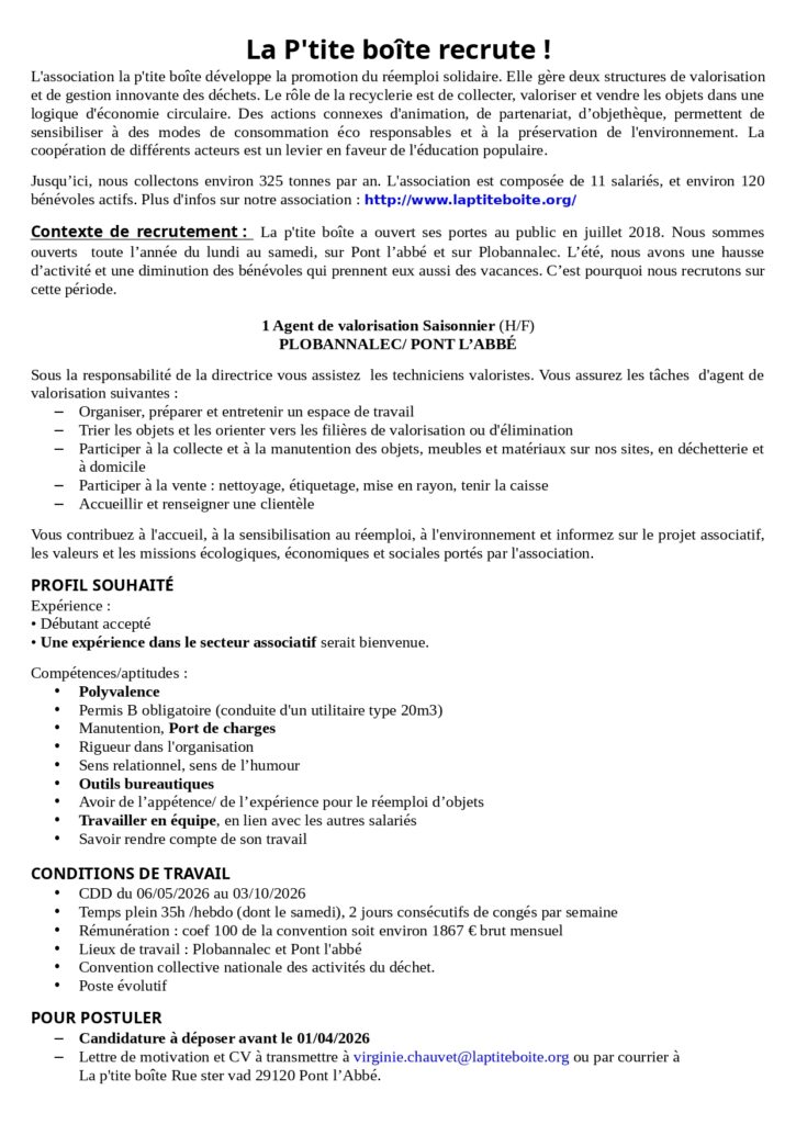 La p’tite boîte est une association qui gère et anime deux recycleries dans le Pays Bigouden Sud.